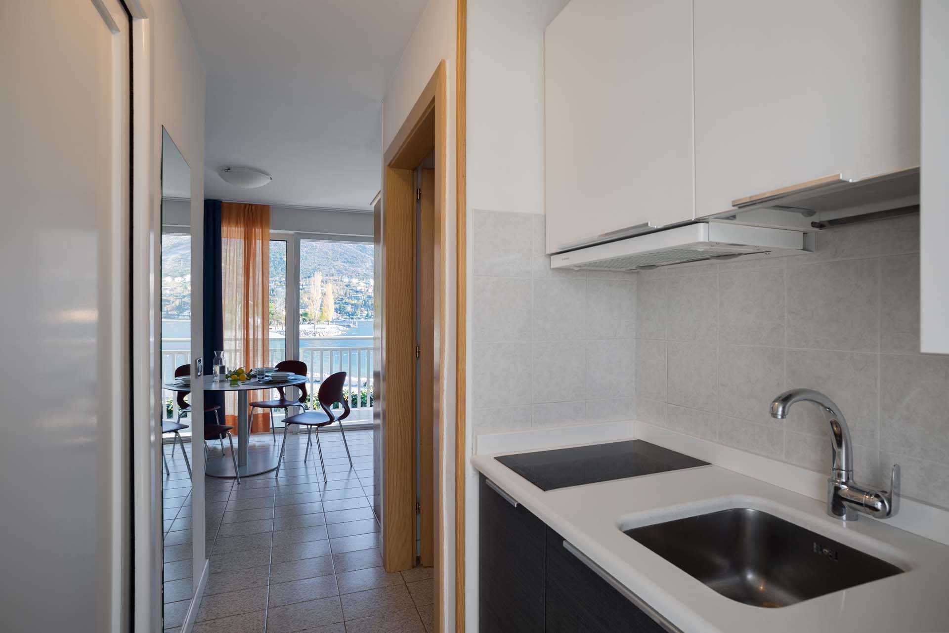 The apartments have tiled flooring throughout and boast a living room with sofa-bed, separate double bedroom, designer kitchenette with induction hob, fridge, sink, stainless steel kitchenware, plates, glasses, cutlery, kettle, coffee machine, toaster, private bathroom equipped with a hairdryer and two balconies offering spectacular views of the lake.
