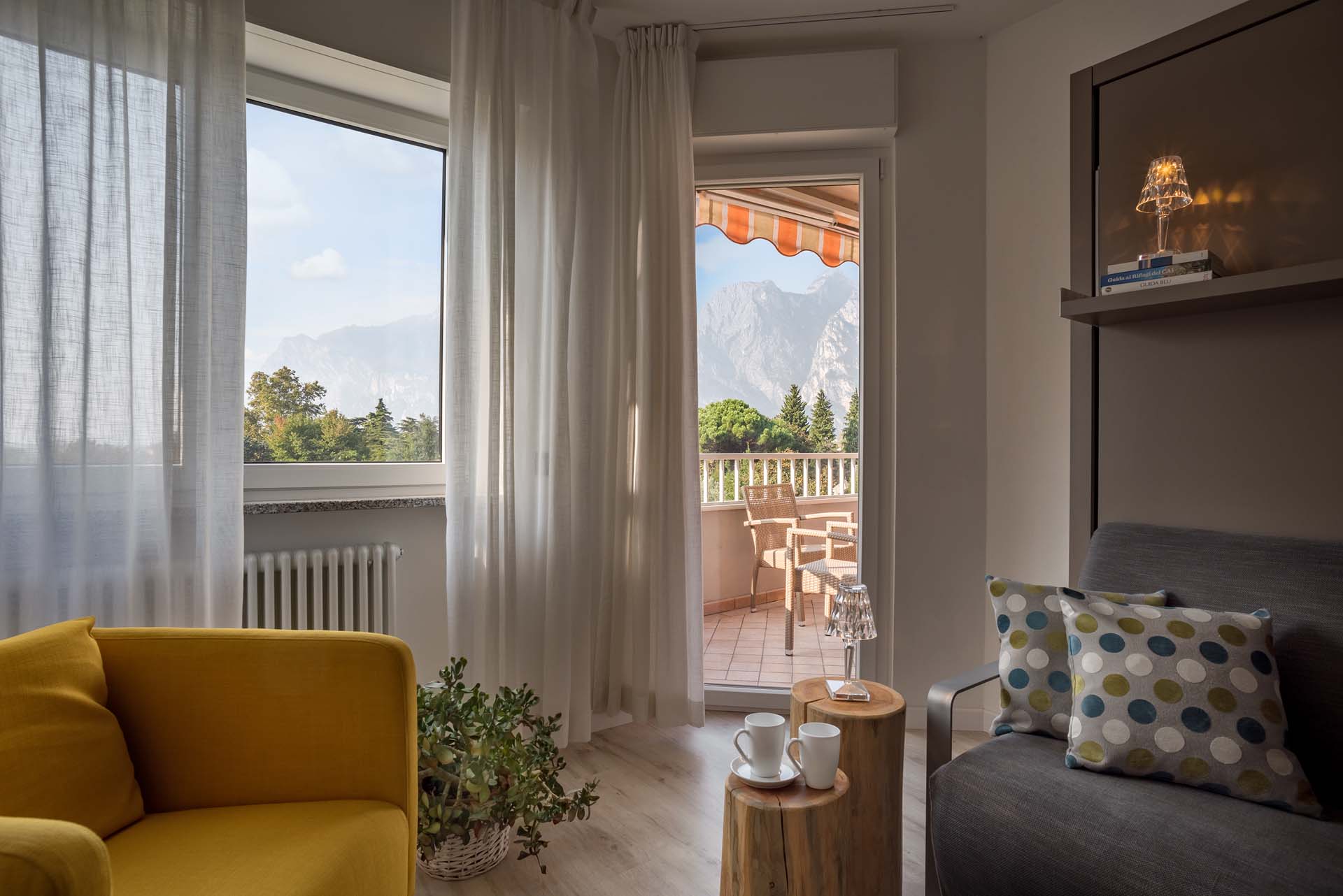 These accomodations of our residence with pool in Torbole sul Garda have a balcony with views over the gardens and Lake Garda.