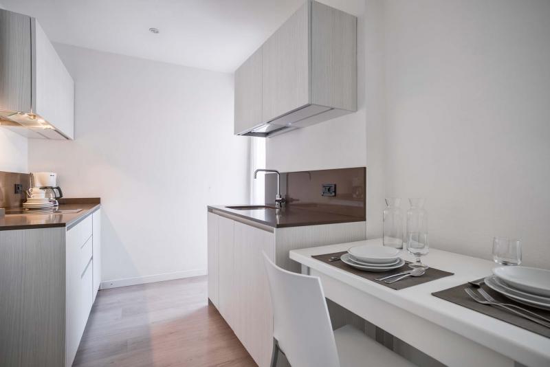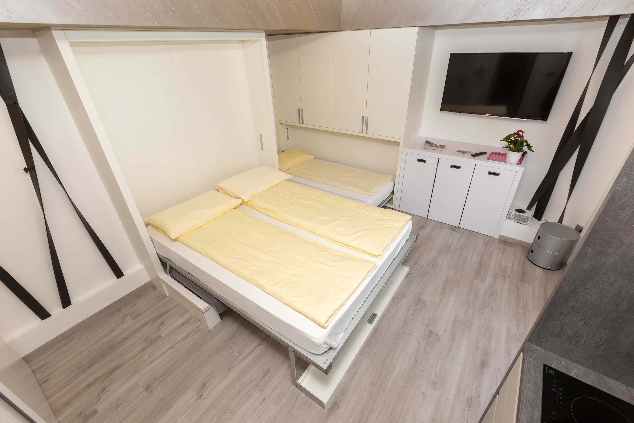 Studio apartment with wooden or parquet flooring, a foldaway double bed and a foldaway single bed.