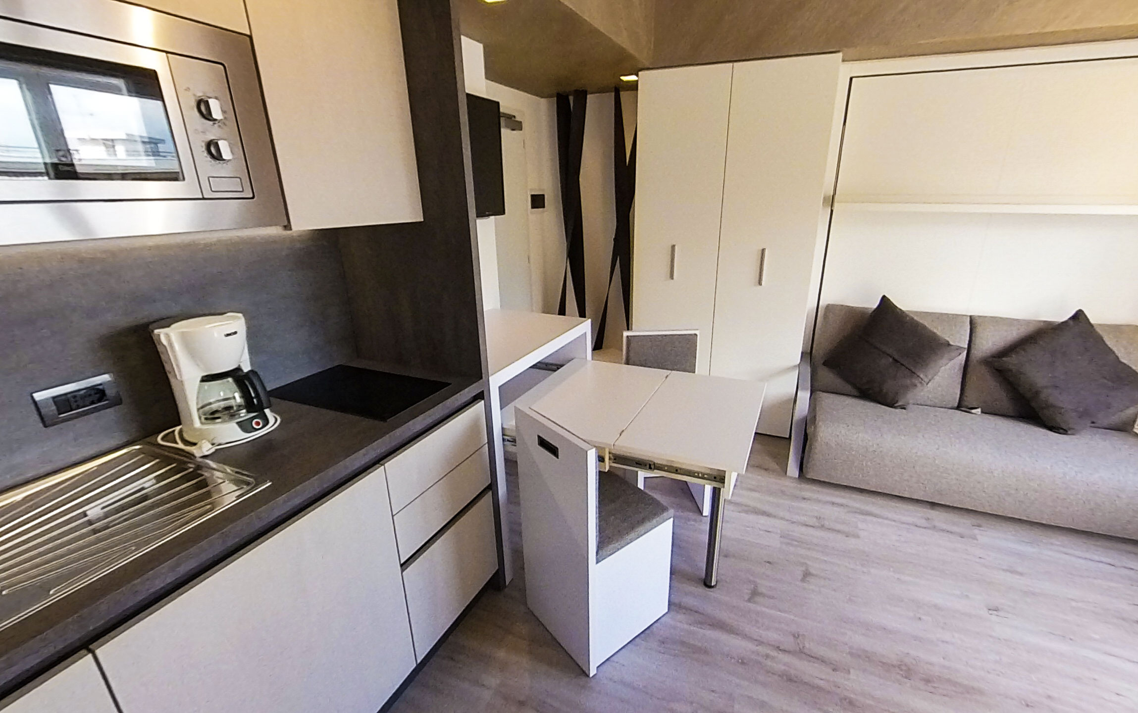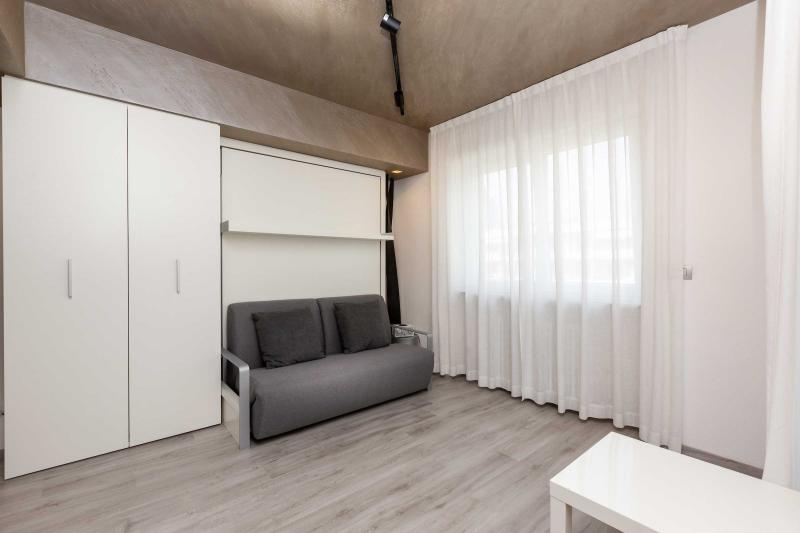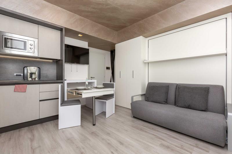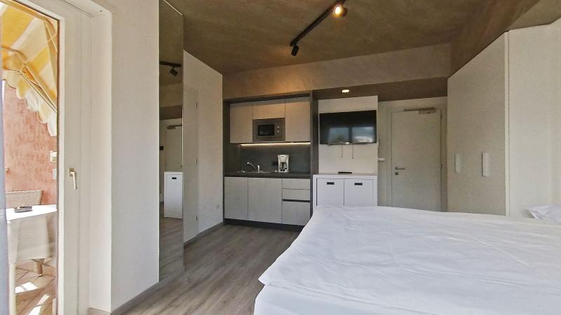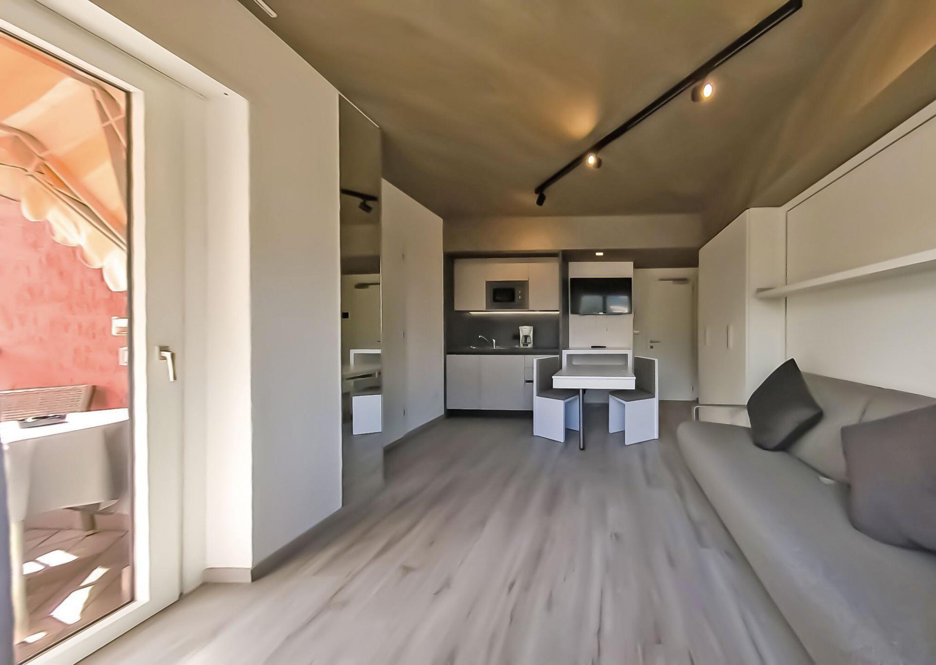 Studio apartment with balcony offering a spectacular view of the mountains, wooden or parquet flooring and foldaway double bed.