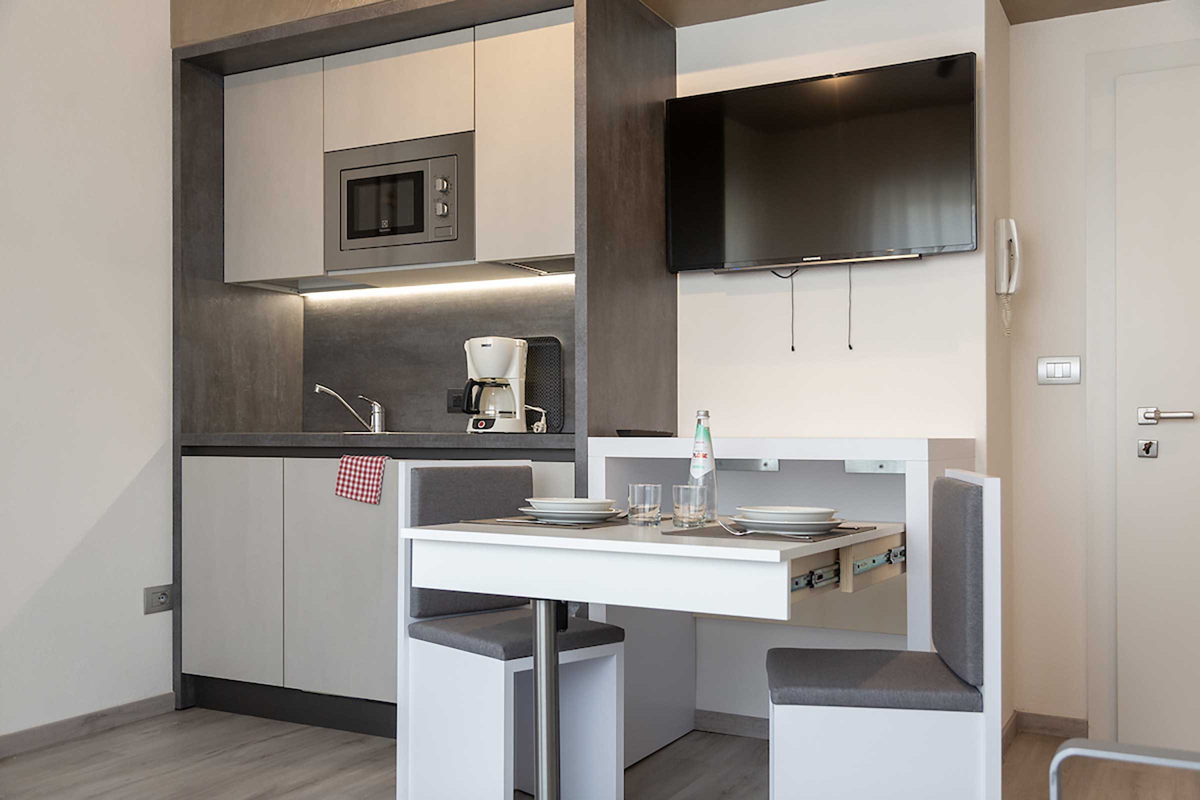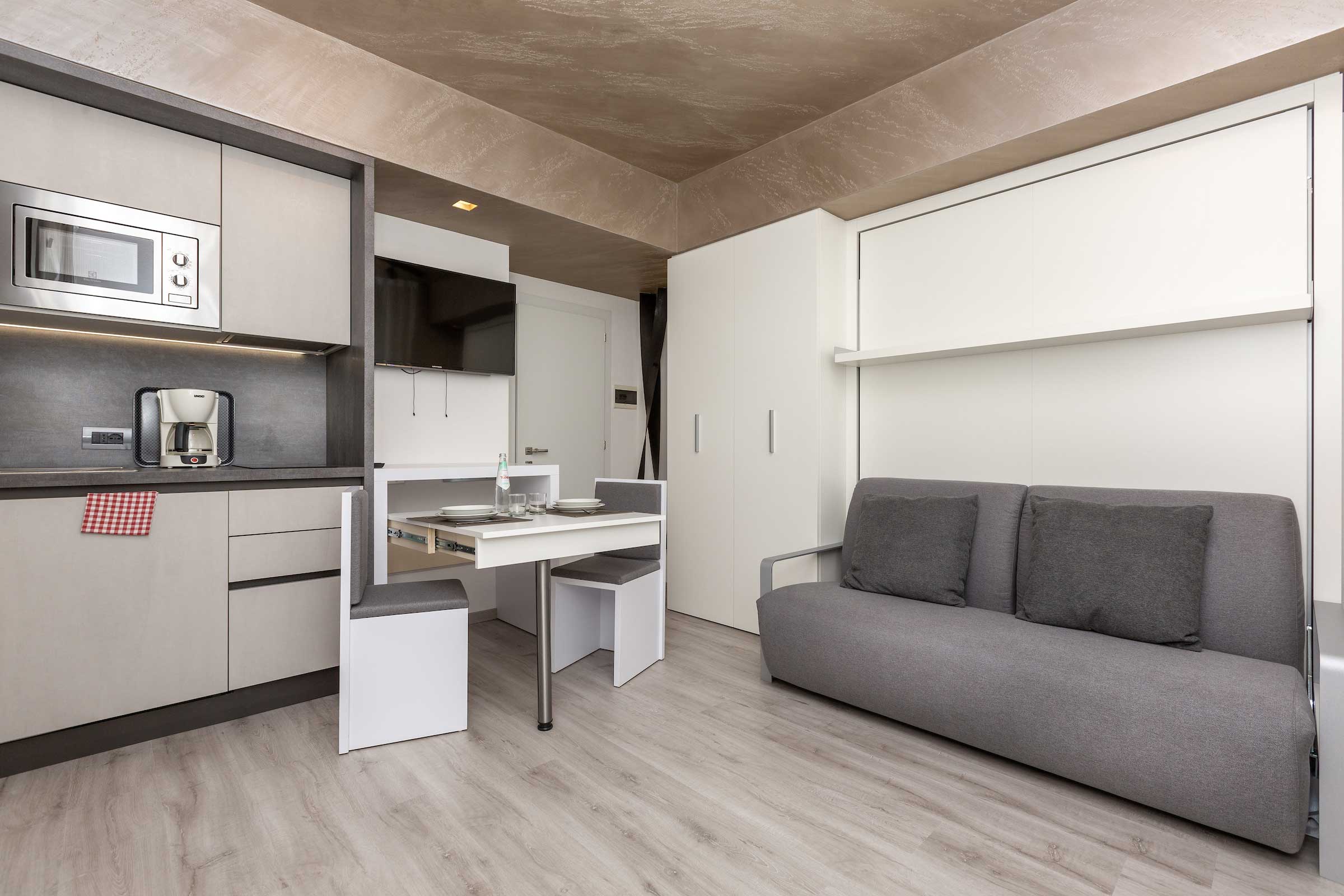 The flat is composed by a kitchenette, one hideaway double bed, TV-SAT, couch, bathroom, and 1 small balcony with north/mountains view